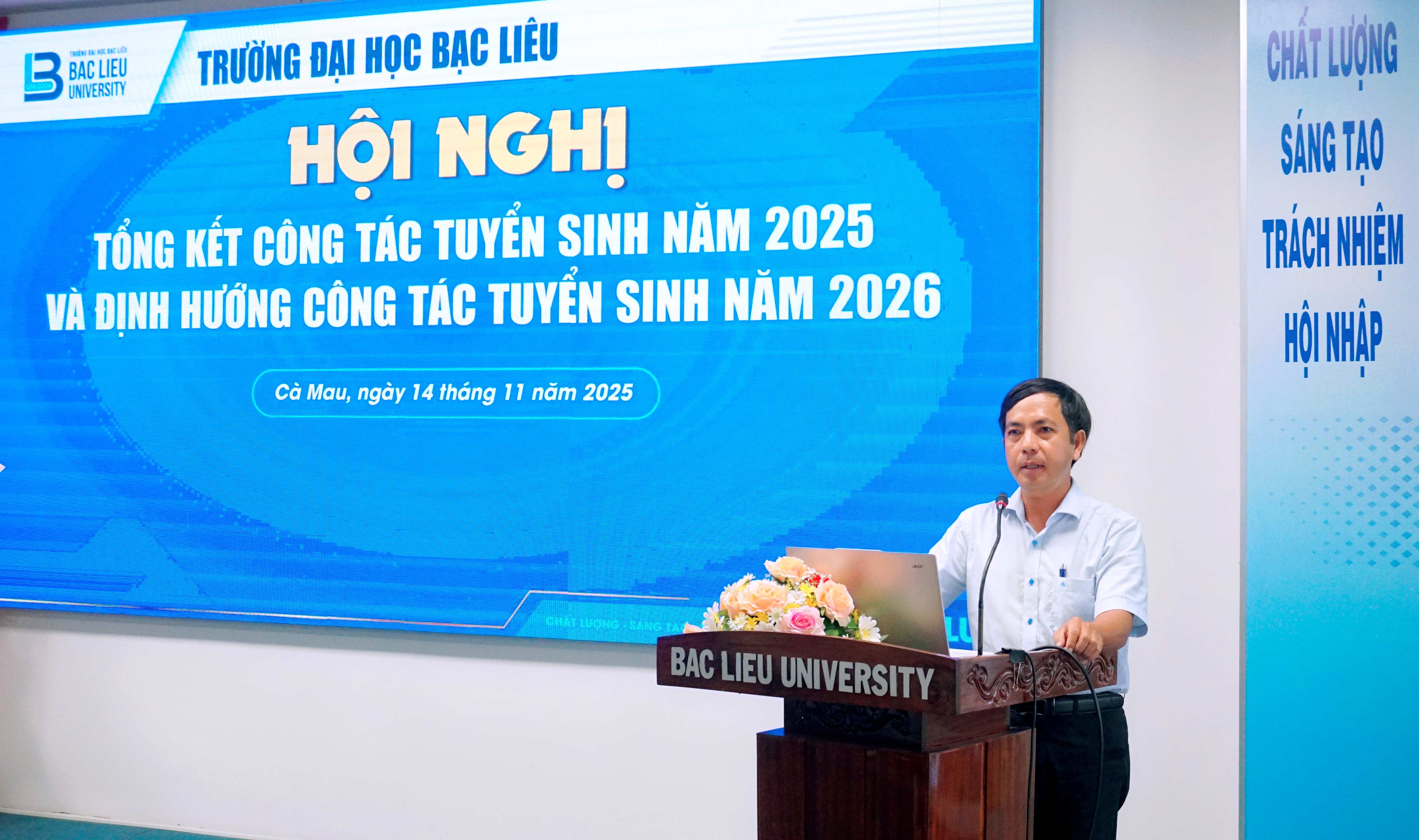 Ngày 14/11/2025, Trường Đại học Bạc Liêu long trọng tổ chức Hội nghị Tổng kết công tác tuyển sinh năm 2025 và triển khai định hướng tuyển sinh năm 2026. Hội nghị có sự tham dự của Ban Giám hiệu nhà trường, lãnh đạo các khoa – phòng – trung tâm, đại diện các trường THPT trong và ngoài tỉnh.