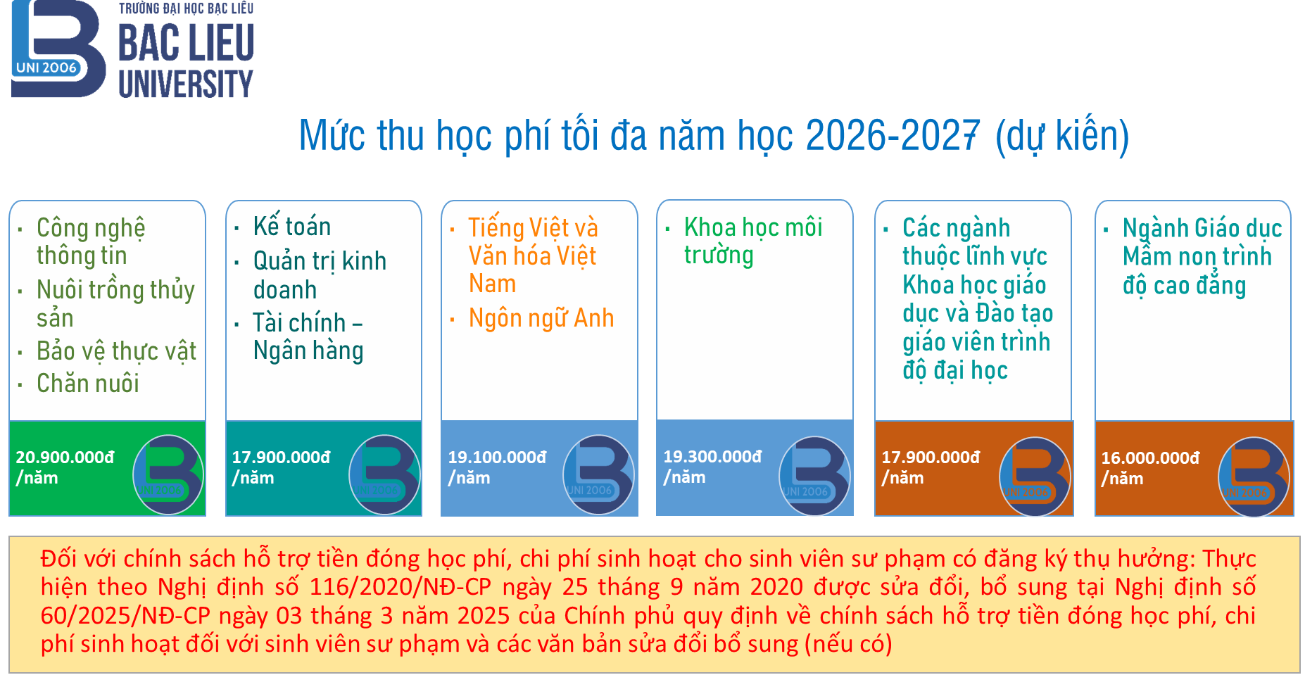 - Đối với chính sách hỗ trợ tiền đóng học phí, chi phí sinh hoạt cho sinh viên sư phạm có đăng ký thụ hưởng: Thực hiện theo Nghị định số 116/2020/NĐ-CP ngày 25 tháng 9 năm 2020 được sửa đổi, bổ sung tại Nghị định số 60/2025/NĐ-CP ngày 03 tháng 3 năm 2025 của Chính phủ quy định về chính sách hỗ trợ tiền đóng học phí, chi phí sinh hoạt đối với sinh viên sư phạm và các văn bản sửa đổi bổ sung (nếu có).